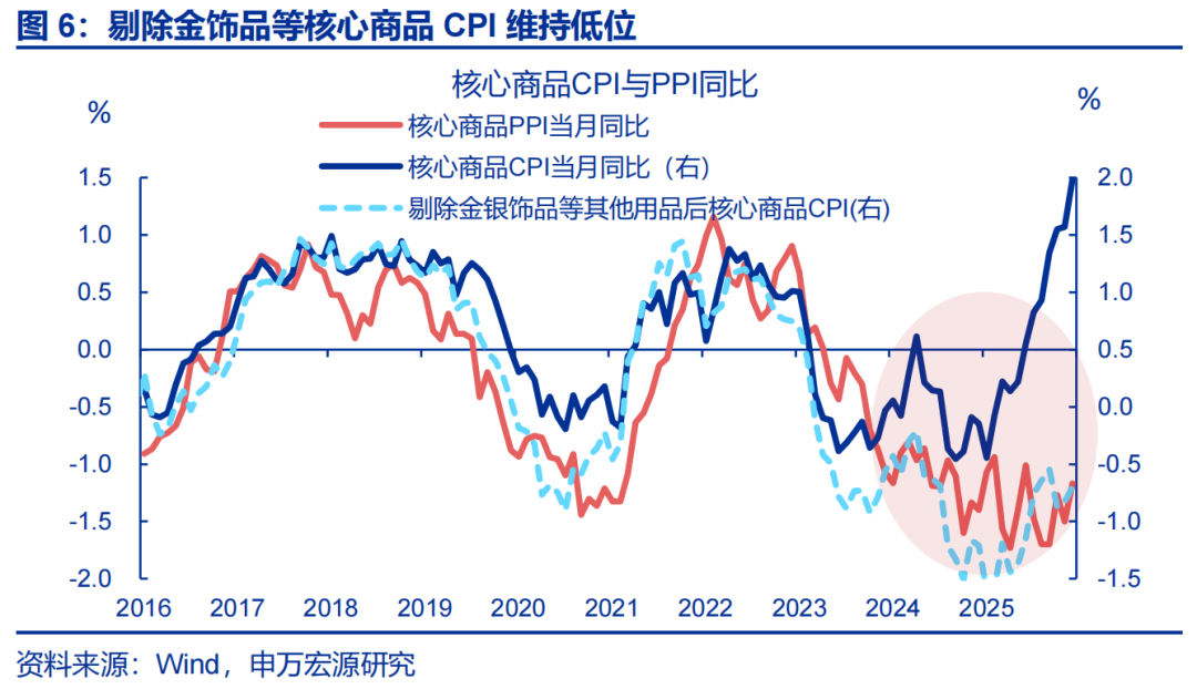 12月CPI同比延续上行,一方面源于金价走高继续对核心商品CPI有较大支撑;而剔除金价影响后,核心商品CPI维持低位。12月CPI环比0.2%,略高于2017年以来的均值(0.1%);CPI同比较前月上行0.1个百分点至0.8%。结构上核心商品CPI同比上行至2%的高位,更多来自金价走高的贡献。12月金价同比上行至57.9%,带动金饰品价格的同比涨幅继续扩大至68.5%;而剔除金饰品后的其余核心商品CPI同比持续磨底、仅较前月上行0.1个百分点至-0.7%。结构上家电CPI再度走强,或更多反映供给的影响,与原材料涨价和反内卷的传导有关,但其他领域价格仍较弱。