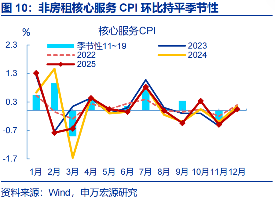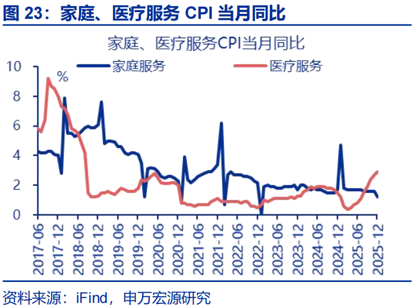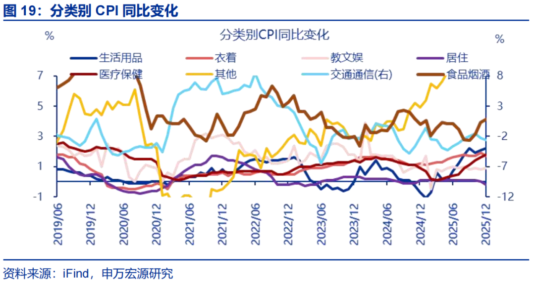 12月CPI同比延续上行,一方面源于金价走高继续对核心商品CPI有较大支撑;而剔除金价影响后,核心商品CPI维持低位。12月CPI同比较前月上行0.1个百分点至0.8%。结构上核心商品CPI同比上行至2%高位,更多来自金价走高贡献;但剔除金饰品后其余核心商品CPI同比持续磨底、较前月上行0.1个百分点至-0.7%。结构上家电CPI再度走强,或更多反映供给的影响,与原材料成本涨价和反内卷的传导有关,但其他领域仍偏弱。