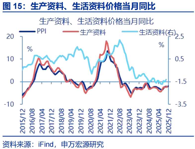 PPI同比回升,其中生活资料回落较大。12月,PPI同比录得-1.9%,与前月相比回升0.3pct。结构上,生产资料、生活资料同比较前月分别回升0.3、0.2pct至-2.1%、-1.3%。