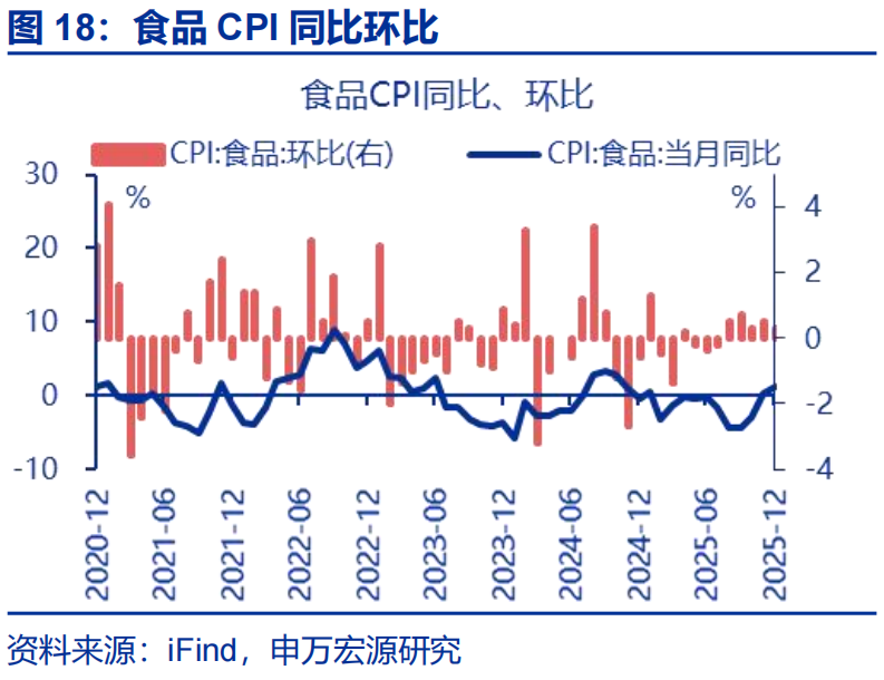 供给减少对食品CPI也有较大拉动,受反内卷影响较大的猪肉价格仍在低位。12月低基数下,食品同比上行0.9个百分点至1.1%,对CPI同比的上拉影响比上月增加约0.17个百分点。具体细项中,鲜菜、鲜果受前期天气因素影响供给偏紧,对应CPI同比分别上行3.7、3.7个百分点至18.2%、4.4%;同时牛肉、羊肉和水产品价格涨幅也均有扩大。相比之下,受反内卷影响较大的猪肉价格仍维持低位,猪肉CPI同比仅上行0.4个百分点至-14.6%。
