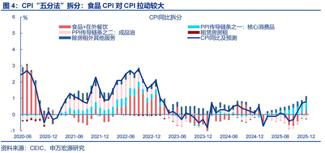 展望后续:相比于上游涨价的影响,反内卷能否持续拉动中下游价格更加关键,我们持续跟踪后续政策效果。过去三年,大宗商品价格仅能解释30%左右的PPI波动,PPI价格更多受到中下游内卷导致价格“超跌”的影响;由于中下游民企占比较高,反内卷政策能否有效传导有待持续跟踪,我们维持PPI弱修复的判断。CPI方面,金价高位,服务消费改善,叠加中下游PPI,或支撑核心CPI上行;但春节错位下,基数走高或约束1月CPI上行幅度,预计1月CPI同比或有下行。